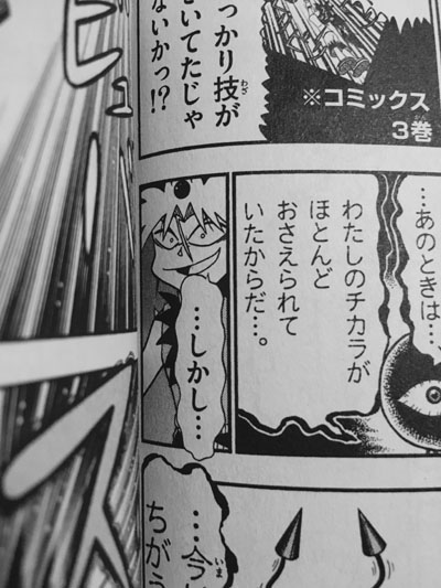 07 November 6巻「復活した宿敵とわざぼー」 のまーの発言について 不要なツッコミの場にする気はないのだけれど、これだけはずーっと言いたかったっていうくだらない話がある。 考察でもなんでもない、というかそれにするにしても話題として有意義なものになる活路が見出せないので、ごくごくくだらない話…… 6巻「復活した宿敵とわざぼー」 で、まー、しゃべんなくて良くない? っていう。 *** この話では、わざ武王が3年4ヶ月ぶりに登場する。以前の戦いで完全復活がどうこう言っていたけど復活するとどうなるのか、聞くからに名前が似てる<わざぼー>と関係があるのか、などが説明される。終盤なこともあり、タネあかしラッシュでスッキリ爽快な回である。 わざ武王が、まーが持っているわざぼーというのは読んでる人は知ってる話だろうから詳細は省く。 とにかく、わざ武王が自身について自らすべてを説明してくれる。 だから、この話。ほんと、まーはわざ武王を手に持ってる以外やることがないんだけれど…… みみみがいくら挑んだって、この時点でわざ武王は無敵なので、まーはご満悦。切れてるけれど、みみみは反撃を食らってやられてしまう。 みみみが技を使ってもわざ武王には効かない、というシーンなのでみみみは技を唱える必然性がある。 だけど、まーはみみみがわざ武王には勝てないことを明確に示すこと以外の活躍は求められていないから、みみみを、より強い力でねじ伏せればいい。描写として強いということがわかりさえすればいいのだ。 技とか唱えるでもなく腕を振り回せばみみみが飛んでいく。 ――みみみピンチ! ――まーとわざ武王がみみみより強いってわかる! ……そもそも、まーが唱える技って悪くて強そうな単語の羅列で、具体的に強いのか否かを名前だけで読者に判断させるのは難しいだろう。 そんなだから、まーが言葉を発する機会がない。技を言う必要もない。 この話で2つしか与えられていない吹き出しセリフの1つが画像の笑いだ。勝利に酔いしれて「ククク」とか言ってるのは、嬉しかったんだろう。 彼の求める強さ、相手に勝つことのできる確実な強さを確認できたのだから。 まーは、そういうことを喜ぶ男だ。 と、まーの人物像を示す印象的なものとして、読んでみることは可能だろう。 *で、もう1つのセリフは 「あのときはこうだった」と話すわざ武王。そして、今は違うということを言わんとしている。その繋ぎのように「しかし」って…… 切れているけど、下のコマの円錐状のものが2本にょろにょろしているのは、わざ武王からはえている。絵的には、一つ目の黒い丸い物体がバイキンマンみたいな触覚をはやしている。不気味というか、キモカワというか、どういう印象をもつかは個人差がある。判断は各自に任せる。 おさえられていたチカラが解放されたために、この円錐が生えてきたように読めるくだりである。 ここで確認しておきたいのは、テキトーに技の名前をとなえると本当にその技が出せるというのがわざぼーの機能ということ。 これまで、わざぼーという武器が自発的に攻撃的な変形をするようなことはなかったので、わざ武王がわざぼーの一種であるならば、この「しかし」が技の名前という話も成り立たなくはない。 でも、なにがどう「しかし」なのか。 デットオアデット的な意味の「死か死」という技で、2つの円錐は死を表している。死以外の選択肢はないという絶望として、いまっ! まさにっ!みみみに突きつけられようとしている!!! というシーンだったのか。 ……自分で書いててそこそこ大爆笑だったけれど、そんな説明はない。だが、わざぼーという武器の機能から類推することは可能。 むしろ、それ以外に、まーが「しかし」を言う必然性はない、と思う。 あるいは、傀儡的な人物としてまーを見ることができる、とも言える。 *……あくまで、「しかし」とだけ言うまーの姿はどんな風に見えるかという話で、別になにも感じなかったという人には揚げ足取り的なツッコミに思えることは承知している。 「ククク」「しかし」って、なんの意味もないんだったら、いっそ喋んなくてよくね? と思った。 それは、登場人物がアドリブするわけではない創作物である限り前提として念頭に浮かぶことだ(すべての創作物が必ずしもそういう作品ばかりだとは思わない)。内容を紹介するうえで話がぶれるような無駄な描写はあまりないものとみて意味を考察した。 ……ただ笑いたかっただけなんだけれど、記事になったかな? PR