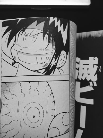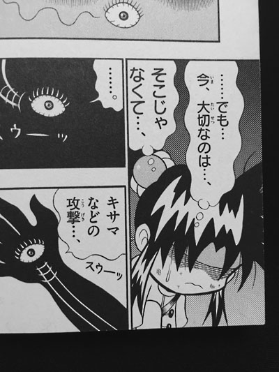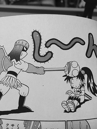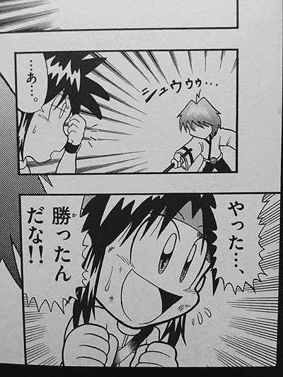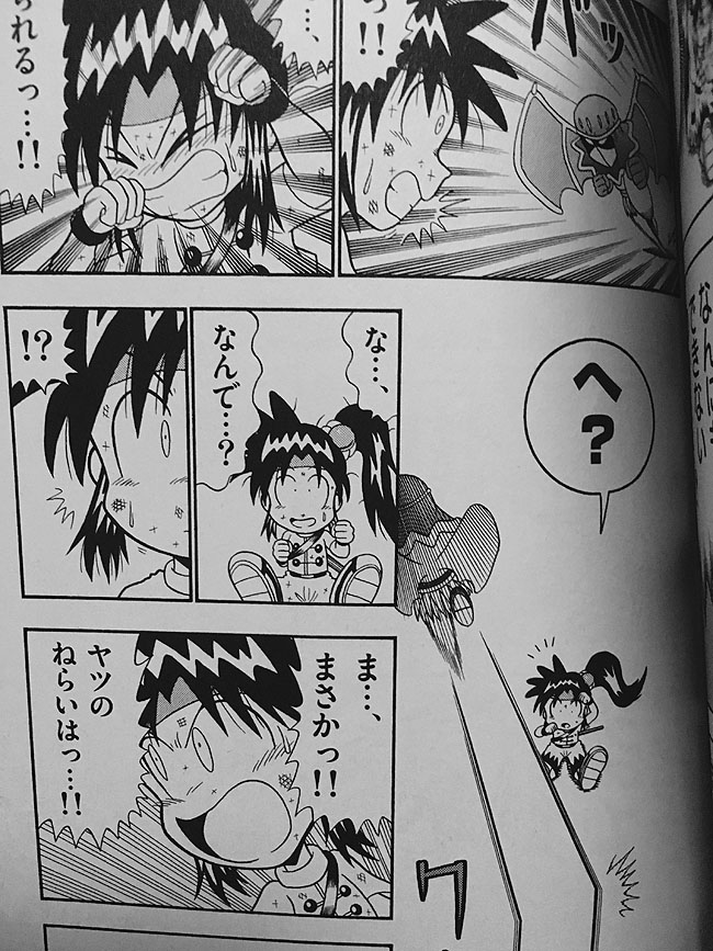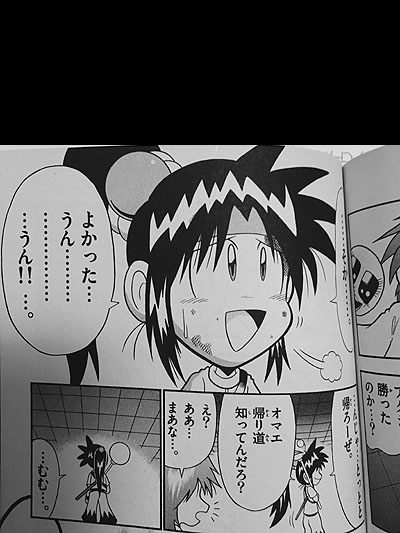 06 November 汗の区分4 ※ 辞書は広辞苑からの引用になります。【】~~~ と表記。【心理的表象】のため汗の描写がされる際の意味について、【困る】【焦る】【苛立つ】を説明し、例をあげてきた。これらはひっくるめて 【緊張】行動への準備状態にあるとき、あるいは次に起こる事象に 対処しようとするときの心的状態。 ということができる。ちなみに、これは心理学での定義のようだけれど、私は厳密な学術的意味を理解していない。あくまで、ここに引用した辞書に載ってる限りの意味でとる。 つまり【緊張】とは、次に起こる事に備えて、それに対処できるかできないかがわからない不安(不安定)な状態といえる。 緊張の状態は対処が完了するまでは継続することになる。事に当たっている最中(緊張が継続した状態)に、これまで言ってきた、 ・ 方策の有無、実行の可否 ・ 時間の経過への意識 ・ 怒り、腹立たしさ が人物の心理的葛藤として浮上したとき【困る】【焦る】【苛立つ】という詳細な意味の区別が顕在する。 だから、事が完了に近づいたり、完了した状態というのもあるわけで、 【弛緩】ゆるむこと。だらしなくなること。ちかん。 辞書の定義がイマイチピンとこないけど、張り詰めていたものがゆるむ。単純に対義語だ。 【弛緩】は事の処理が完了に近づいた、あるいは完了した状態。その際の心情として、安心。また、予期したものより悪いことにならなかったため拍子抜けした場合の汗をこれに区分する。 * * *言葉の説明が長くなったけれど、以下に例をあげる。 [緊張] 3巻 [緊張] 3巻 みみみは緊張状態だが事を完了しつつある。一方、わざ武王は事に直面して緊張している。 [緊張→弛緩] 3巻 コマの進行のとおり、緊張から弛緩つまり事の最中から完了に向けての推移が汗に現れている。 [弛緩] 3巻 安心した 。 [弛緩] 2巻 みみみ、拍子抜け。 * 話が長くなっているが、おさらい。 2巻 (クリックするともう少し大きな画像になる)上に引用した1ページ(開いたらちょうどよさそうだったので持ってきた)について、これまでに話した汗の意味の区分を念頭に置きつつ、みみみの汗について解説する。 汗は以下のような心理的表象の意味にとれる。 ・ 1コマ目……緊張 ・ 2コマ目……焦り ・ 3コマ目……<汗なし> ・ 4コマ目……弛緩 ・ 5コマ目……緊張 ・ 6コマ目……焦り なるべく作業の手間を省こうとして画像処理が雑で申し訳ないけれど、切れてる7コマ目には敵の行動をあらわした効果のみが描画されている。人物は描かれていない。(おそらく、次のページで詳細を明かす「ヤツ(注・敵)のねらい」について読者の興味を引きつけるためのコマ)1コマ目の【緊張】は眼前に迫り来る敵の攻撃に対するもの(A)で、2コマ目でみみみは攻撃を受けるしかなく刻一刻と迫る痛みに備えて【焦って】(A)いる。しかし、3コマ目のとおり敵は攻撃をしなかった。4コマ目でみみみは敵に攻撃を受けるという事からの緊張が解けた【弛緩】(A)の汗を流す。しかし、何かに気がついて5コマ目の汗は新たな事に対する【緊張】(B)を表す。6コマ目はセリフで言ってる「ヤツのねらい」が刻一刻となされるために【焦って】(B)いる。 という具合に、汗の意味は移り変わっている。 このシーンでは、汗を描きこまれた人物(みみみ)が対処を迫られている事(見分けがつくよう(A)(B)と振った)に直面して(【緊張】)から完了する(【弛緩】)までがセットになっている。汗が表象するものが、事(A)に対する【弛緩】ののちに、新たな事(B)への【緊張】になっており、対処する問題が切り替わっていることがわかる。確かに場面は戦闘中でずっと汗かいてるんだなー、と言えなくもない。けれど、運動のために体温が上昇して汗が流れるなんていわずもがなのことだし、そんなことを説明するために汗を書き込んでいるわけではない。 ほんとに昔はバカなことを臆面もなく言ったもんだ!(汗) 色々書いてきたけれど、状況から判断して、弛緩(事の処理が完了した)以外の汗について、困ってるのか、焦ってるのか、苛立っているのか判断がつかない場合はすべて【緊張】ととればいい。 何に対して緊張しているかを考えると、マンガをよりいっそう面白く読めるのではないか。 PR