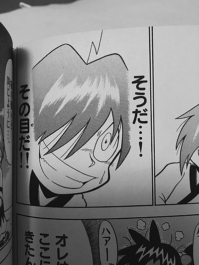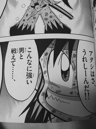 06 November 発汗の区分5 ※ 辞書は広辞苑からの引用になります。【】~~~ と表記。すべてを確認しつくしたとは言えない。とりあえず、まとめてしまおうという勢いでの作業なので後に訂正が必要になってくるかもしれない。 発汗についての例示は今回で終え、次の記事でまとめられるといいなあ。 人物が発汗するのは大体の場合、攻撃を受けたり不測の事態が起こるなど困難が向こうから迫ってきたかのような状況であり、受動的な立場で事に直面することが多い。そのため、処理から完了に向けてどうしてよいかわからないという【困る】【焦る】【苛立つ】の意味として読みとれる例が多い。 また、処理への不安を孕んでいるため、完了に向かってポジティブな感情(安心、喜び)への移行が見られる。 しかし、処置に苦しむ。どうしてよいかわからず苦しむ、迷惑するという【困る】のように事に対する苦しみの感情には起因しない、【苛立ち】のように腹を立てるでもない感情による発汗の表現もあった。 【楽しむ】①たのしいこととする。愉快に感ずる。また、趣味や娯楽とする。 ②期待をかけ、それを喜ぶ。 汗の表象はそもそも【緊張】であるけれど、それを困難として苦しむ気持ちではなく、楽しみ、積極的に向かっていくこともある。 * * * 2巻 みみみは追いつめられながらも強敵むむと戦うことを楽しんでいる。 2巻 むむもうれしい。 ほんとは4巻のシッポウが例としては妥当なのだろうけど、単体で持ってくるのは憚られたのでやめた。(お察しください) このように笑顔のなかに汗が描きこまれることが多いが、注意したいのが【楽しむ】は事態に直面また対処している最中のものであり、【緊張】状態にみられるものだ。事態への対処が完了に近づいているか、完了した場合の笑顔での発汗は【弛緩】に区分する。 [弛緩] 2巻 PR